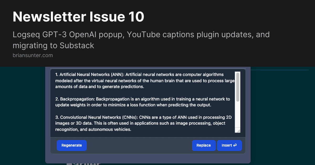 I migrated the newsletter to Substack, released a big update to the Logseq GPT-3 OpenAI plugin, and added some features to the Logseq YouTube captions plugin.
